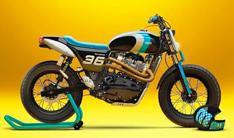 A flat tracker concept based on 650 twins. It got flat headlamp with blue colored fork below it. Single exhaust system with fat tyres on both the sides.